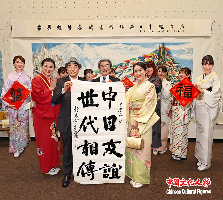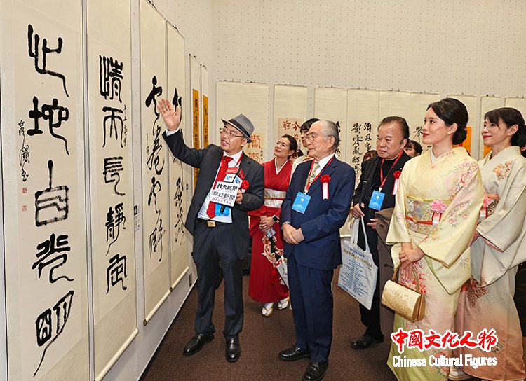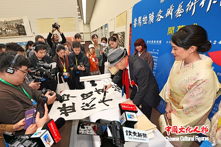 日本前内阁府特命担当大臣、日本众议院议员江崎铁磨,原日展常务理事、日本书艺院理事长、全日本书道联盟副理事长杭迫柏树,中国书法家协会理事、中国美术家协会理事、西泠印社理事容铁,中国文化人物杂志社社长王保胜,日展审査员、日本著名画家藤岛博文,创价学会副会长、富士美术馆事务局局长金子朗,东京中国文化中心主任罗玉泉,东洋书道艺术学会会长、理事长松本啓祐,全日本华侨华人联合会副会长、世界艺术家联盟主席、全日本华侨华人春晩总导演程波,在日中国企业协会会长王家驯,朝日新闻社社长助理、编辑委员会委员、中国局局长坂尻信义,东京都日中友好协会副会长永田哲二等中日两国嘉宾为展览剪彩