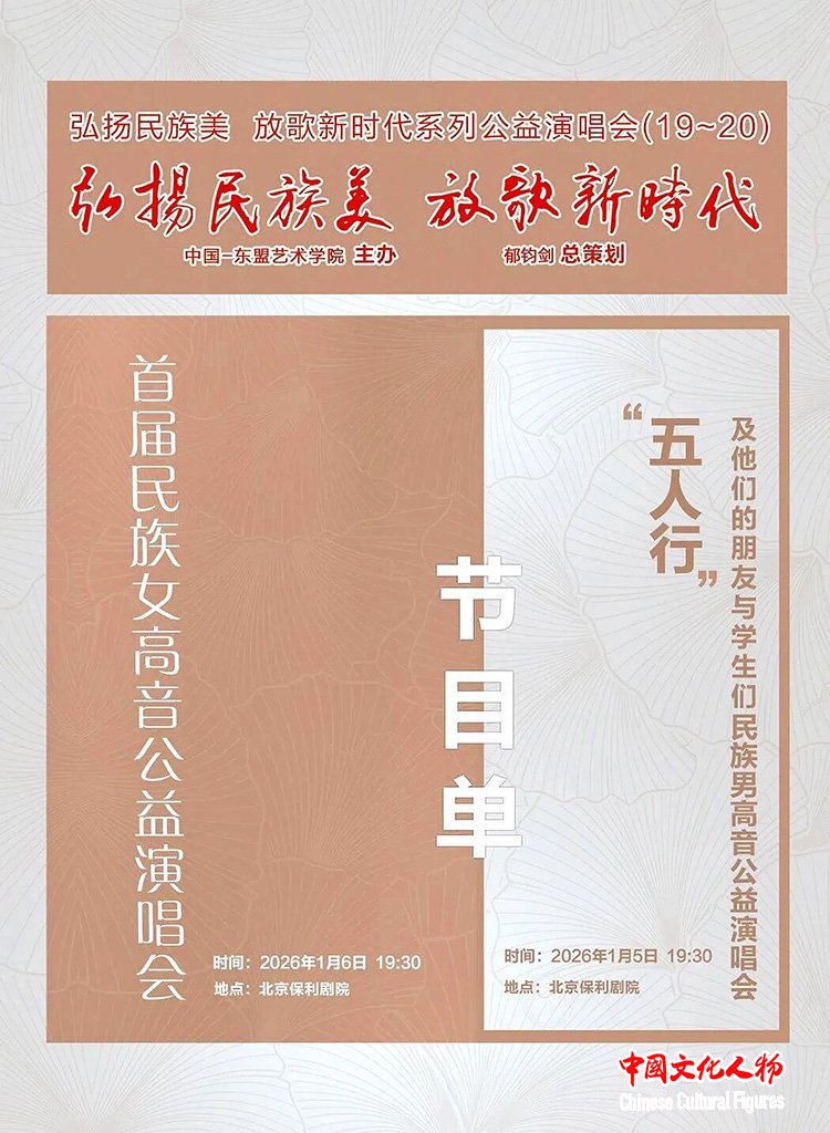 中国文化人物(记者 马将平)2026年1月6日,由中国-东盟艺术学院主办,中国-东盟艺术学院院长、哈尔滨音乐学院名誉院长、博士生导师、博士后导师郁钧剑策划的“弘扬民族美 放歌新时代”首届民族女高音公益演唱会在北京保利剧院上演。
