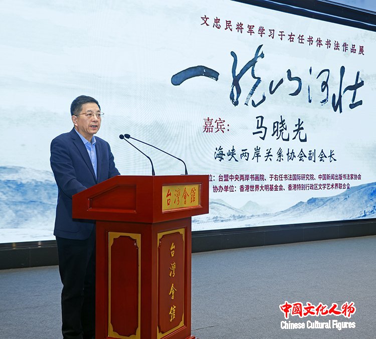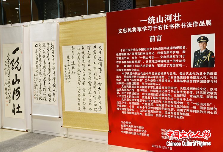 中国文化人物(记者 马将平 苏晴)笔墨传情寄初心,文脉相连聚同心。1月15日,由台盟中央两岸书画院、于右任国际书法研究会、中国新闻出版书法家协会联合主办,世界大明基金会(香港)、香港特别行政区文学艺术界联合会协办的“一统山河壮——文忠民将军学习于右任书体书法作品展”在北京台湾会馆隆重开幕。本次展览以文忠民将军研习近代书法巨匠于右任“标准草书”的艺术成果为核心,搭建起两岸文化艺术交流的桥梁,用笔墨丹青传承爱国情怀,诠释两岸同根同源的血脉羁绊。