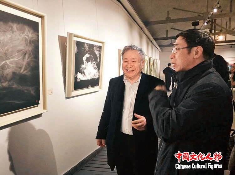 李庚先生与评论家殷双喜先生在展览作品前交流