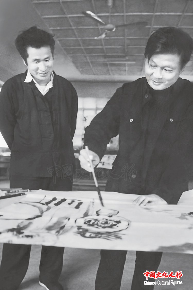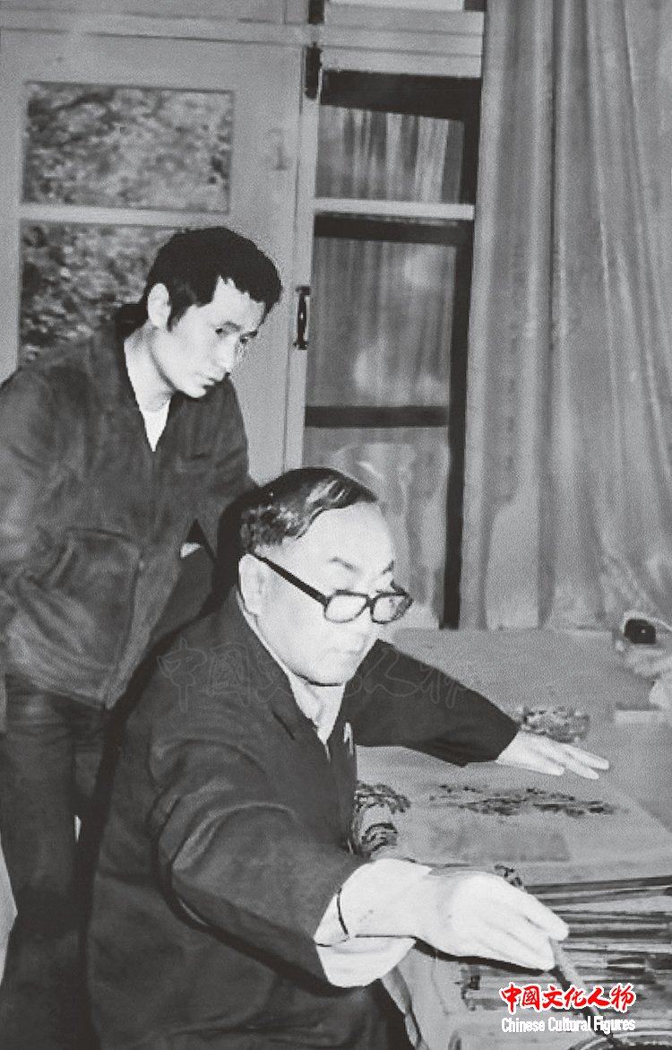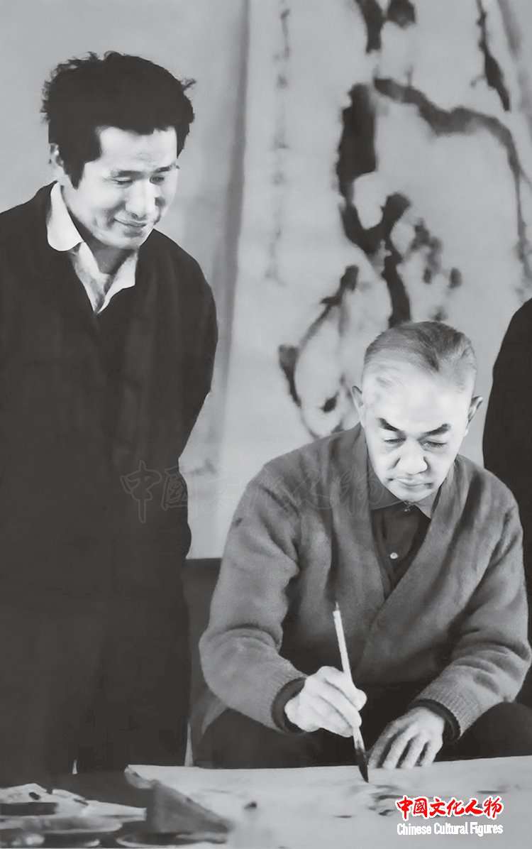 李庚先生与画家关山月先生在一起,向他学习梅花
