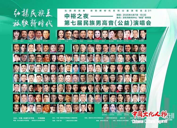 中国文化人物(记者 苏晴)弘扬民族美,放歌新时代。由中国-东盟艺术学院、中裕能源主办,深圳市文学艺术界联合会、深圳市音乐家协会、成都大学支持,中国-东盟艺术学院音乐与舞蹈学院承办主办的“中裕之夜——第七届民族男高音公益演唱会”将于4月7日19:30—23:00在深圳湾体育中心“春茧”体育馆举行。