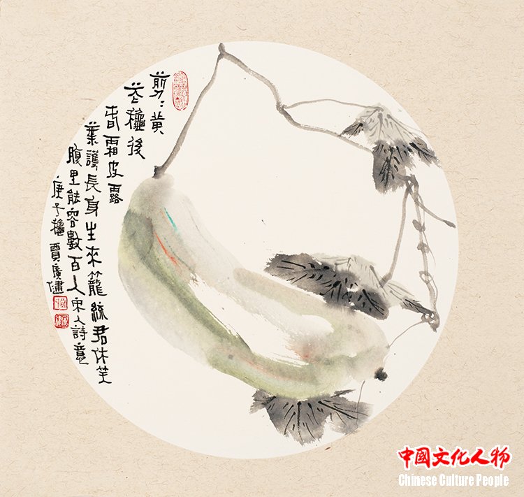 Jia Guangjian has in-depth research on the traditions of freehand flower-and-bird and mogu paintings of the Ming and Qing dynasties. He has especially absorbed the essence of two schools of painting: the Qingteng Baiyang (meaning “Blue Vine and White Sun”), represented by Xu Wei and Chen Chun, and the Wumen. By combining traditional composition with modern structure, the lotus joints, autumn melons, red flowers, and ink leaves in his works all exude vitality and a fresh, agile atmosphere.