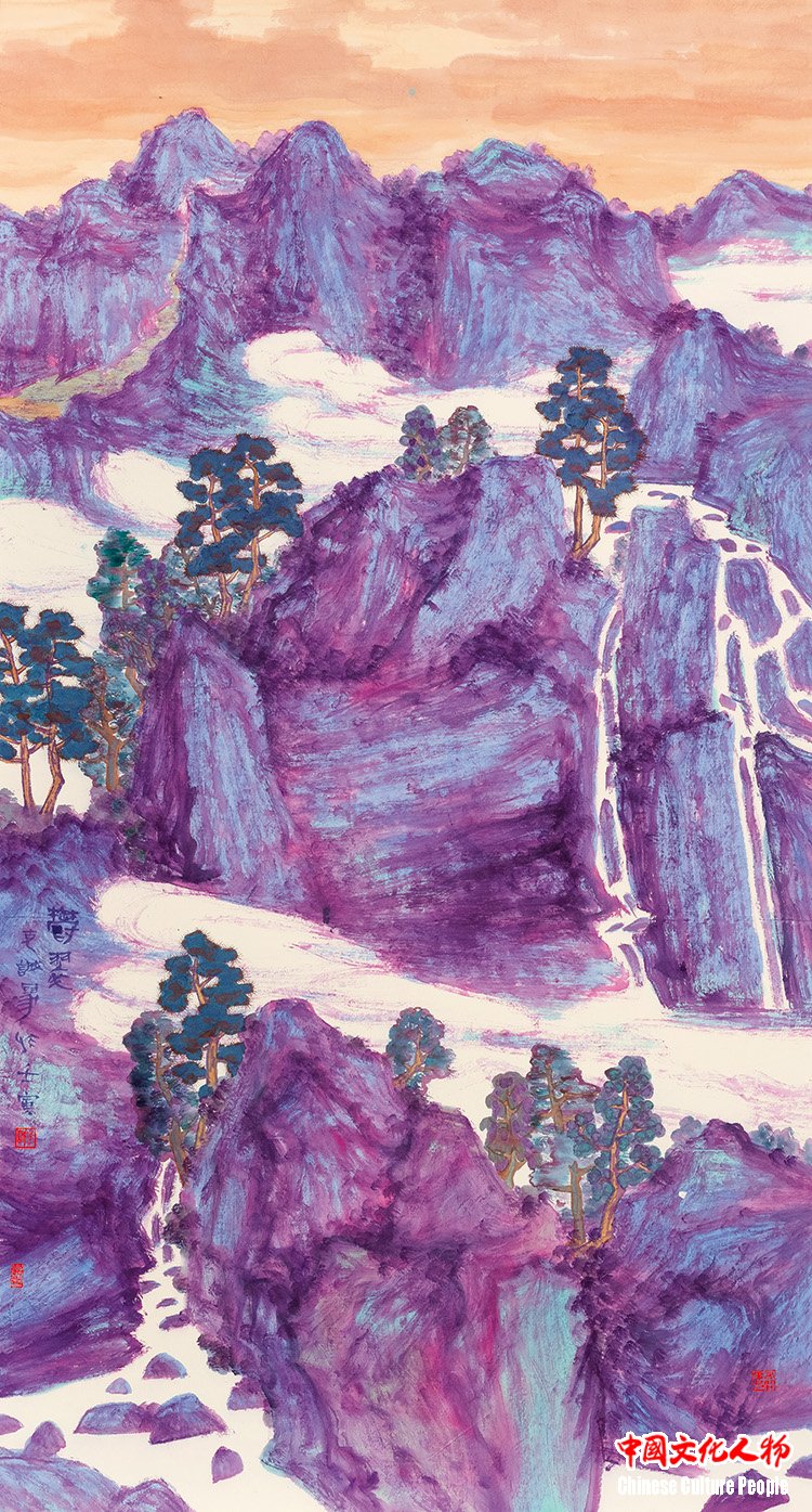 Niu Kecheng deeply explores the traditional color system in color-ink freehand landscape paintings. He connects the “Five Elements” philosophy with the “Five Colors” system and masters hue and color temperature. He also inherits the Northern School painting style of the “Two Lis” (Li Sixun and Li Zhaodao) from the Tang dynasty, as well as the traditions of light crimson landscape paintings and green landscape paintings. Through these, he expands the aesthetic connotation of Oriental art.