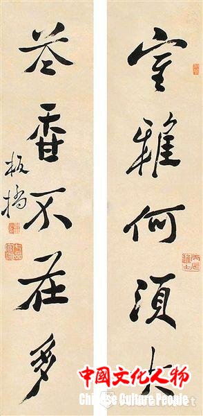 郑板桥作品中,和《难得糊涂》相对应的书法,还有一幅是《吃亏是福》。但是这两幅字的艺术处理手法完全不一样:《吃亏是福》处理很保守,比较笨拙,可能作者认为老实人容易吃亏,而这种吃亏恰恰是智慧。从中我们可以窥见,针对不同内容,郑板桥会采用不同的艺术手法,极有匠心。郑板桥也有很多对联,写得虽然很怪,但是很雅。例如“室雅何须大,花香不在多”,还有“删繁就简三秋树,领异标新二月花”,大小跌宕,非常漂亮。