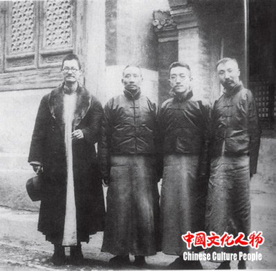 1920年,蒋梦麟、蔡元培、胡适、李大钊(由左至右)在小院门口合影